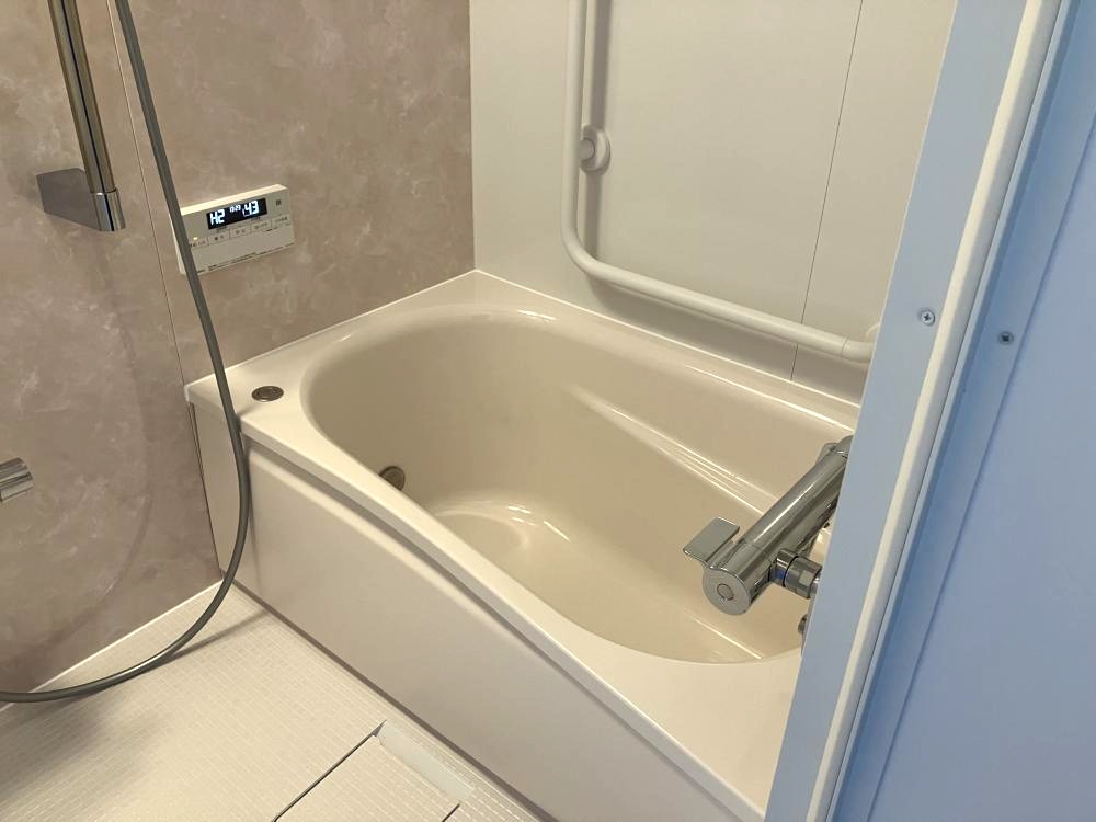 これまでのグリーンから、パッと明るいホワイト基調の浴室へ。見た目の清潔感はもちろん、浴槽横にはL字の手すりを新設し、フルフラットな床への改修と合わせて、将来まで見据えたバリアフリー設計をご提案いたしました。